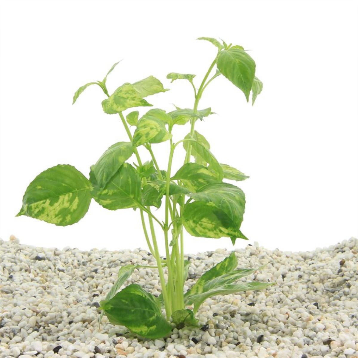 Nomaphila variegata is een opvallende aquariumplant met breed, langwerpig blad en een contrasterend patroon van groene en lichtgele tot crèmekleurige nerven. Deze variëteit combineert de stevige groei van Nomaphila siamensis met een decoratief uiterlijk, wat hem ideaal maakt als eyecatcher in de achtergrond. De plant groeit snel, is sterk en helpt bij het stabiliseren van het aquariummilieu door voedingstoffen op te nemen.