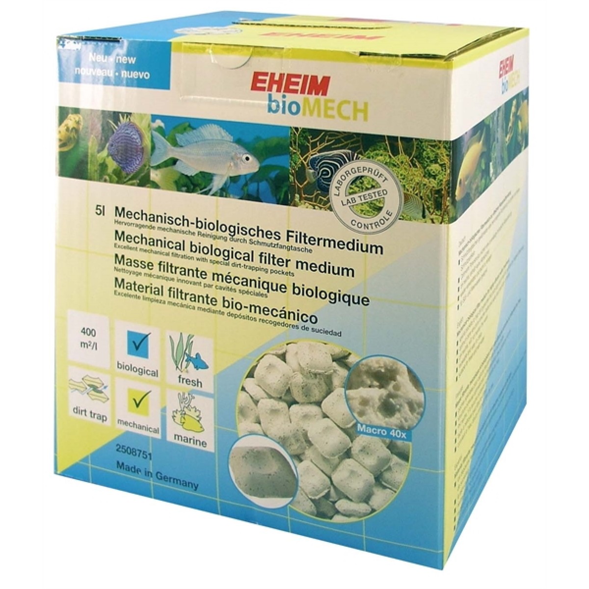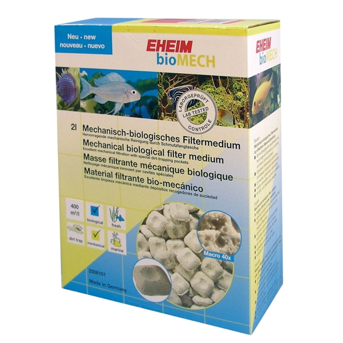 Eheim BioMech is een innovatief filtermateriaal dat zowel mechanische als biologische filtering combineert in één medium. Dankzij de speciaal ontworpen holtestructuur met opvangzakken worden zowel grove als fijne vuildeeltjes effectief vastgehouden, terwijl tegelijkertijd nuttige bacteriën zich kunnen vestigen voor biologische afbraak van schadelijke stoffen.